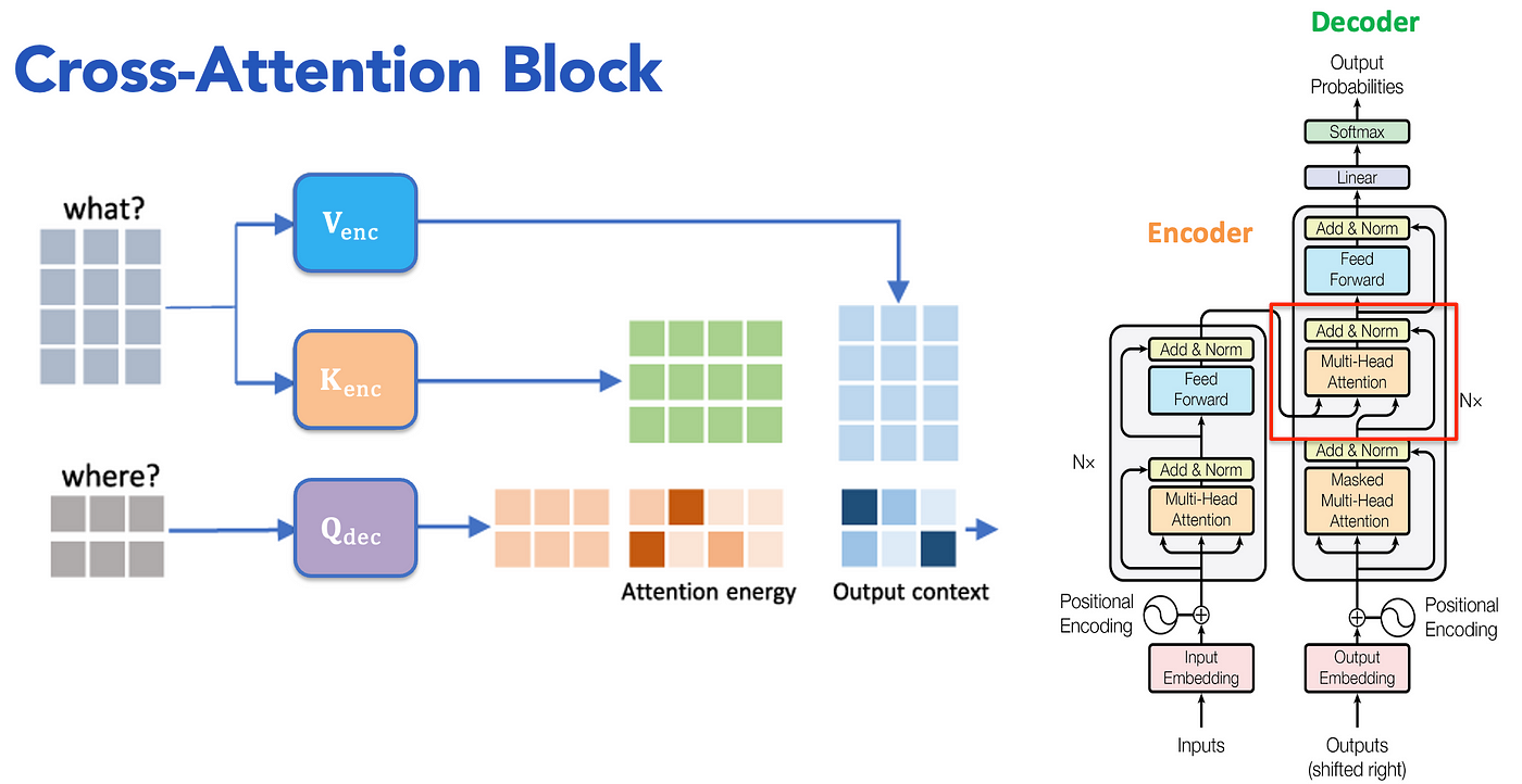 Mathematically, it’s largely the same with a small twist. We take the query vectors from the target langauge (decoder) and use the key & value vectors from the source language (encoder).
